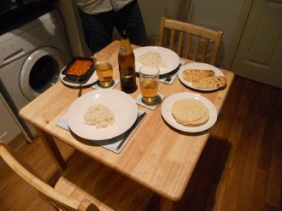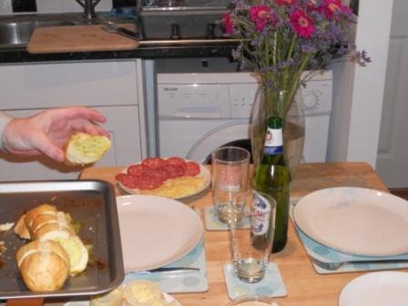 The first course was garlic bread and baguette buttered with salami and cheese... creative! Apparently he also bought Italian wine and frozen pizza just in case of disaster! Cute! We enjoyed the first course while listening to Italian opera music!