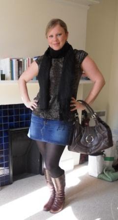 Dorothy Perkins Leopard Print Banded Waist Top, Uniqlo Dark Wash Denim Mini, H&M Black Tights, Gabor Brown Riding Boots, Uniqlo Black Stole, Payless Brown Hobo Bag, Accessorize Gold Disc Earrings, OPI Curry Up Don't Be Late Nail Polish