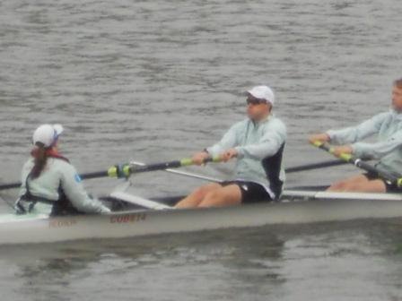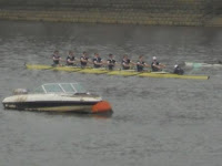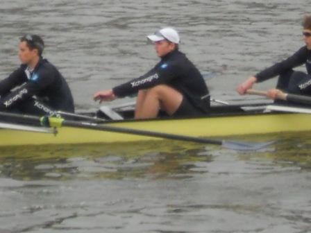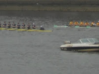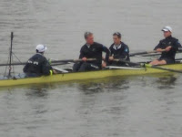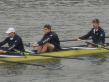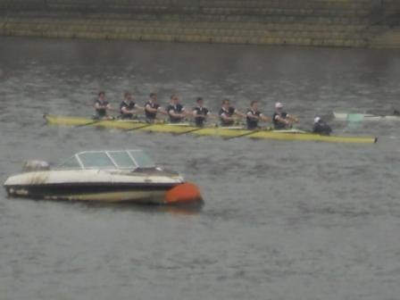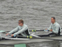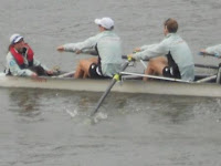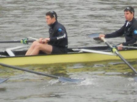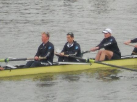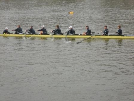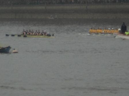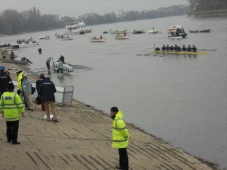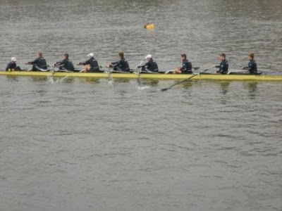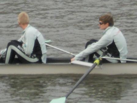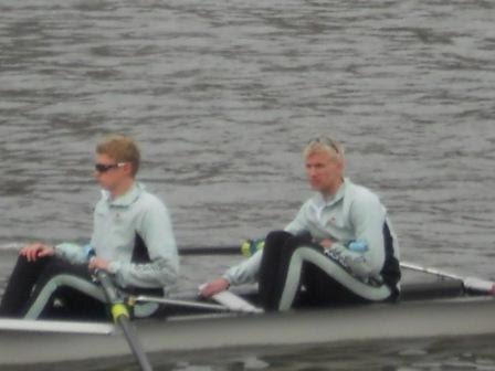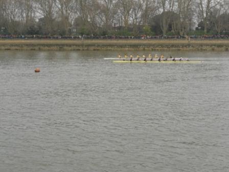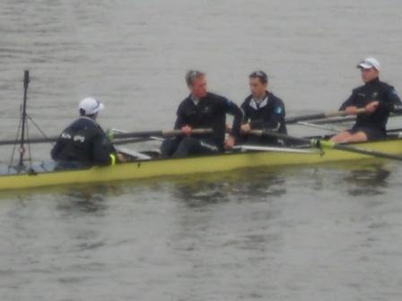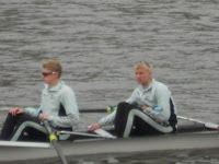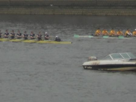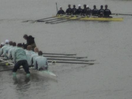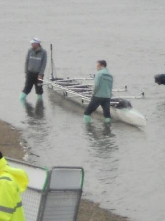 In this photo, you can see both boats in the water! They got in about 500 yards in front of Putney Bridge (the starting point) and rowed back to their positions.