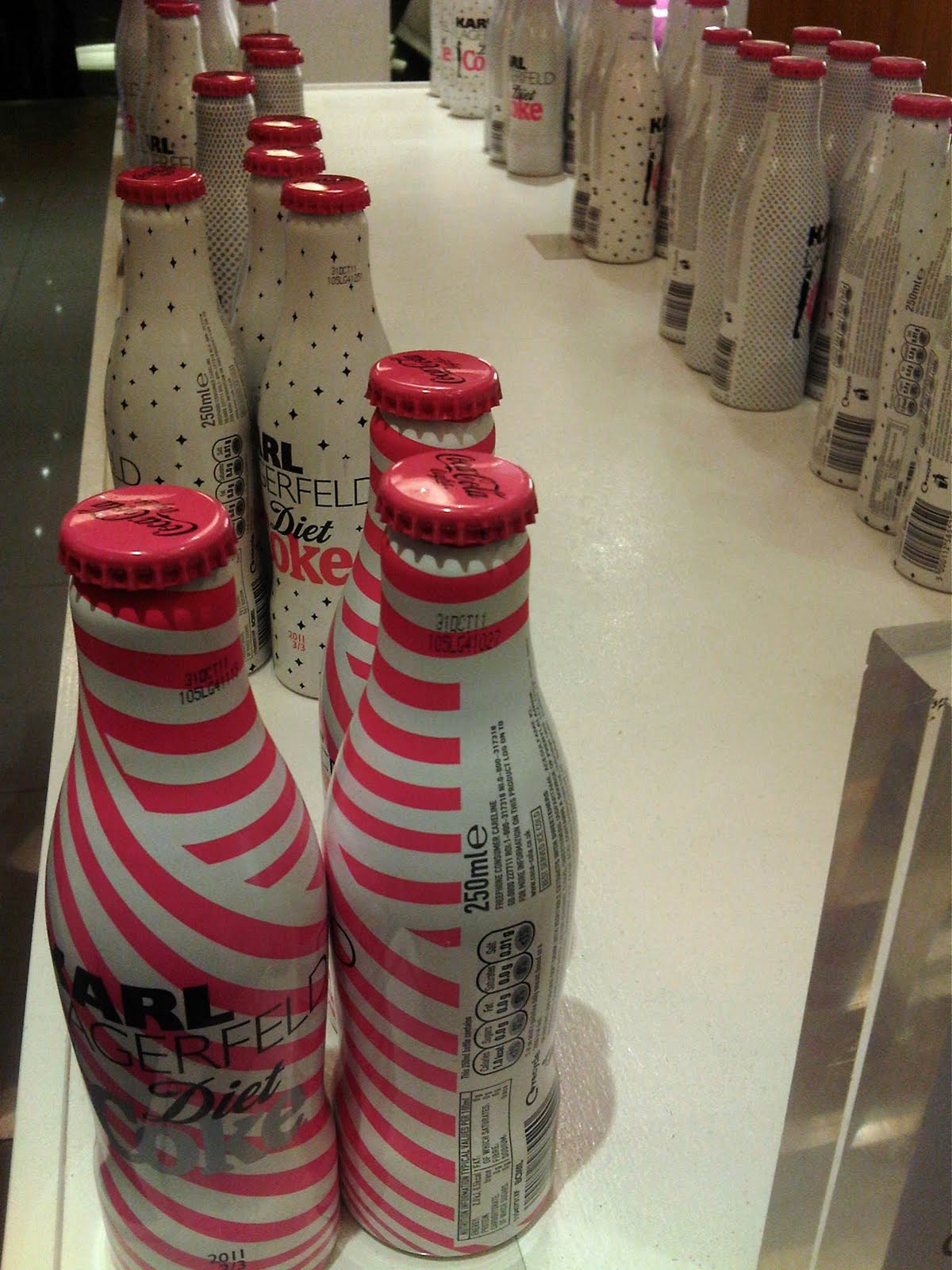 Karl Lagerfeld has designed some limited edition collectable Diet Coke bottles and they're all decorated in black, pink and white. They're adorable and would be an adorable inexpensive gift for your favorite fashionista! Marc bought me the pink and white striped one against my protesting, but now I'm happy to have it! It will look cute among my collection of other weirdo knick knacks!