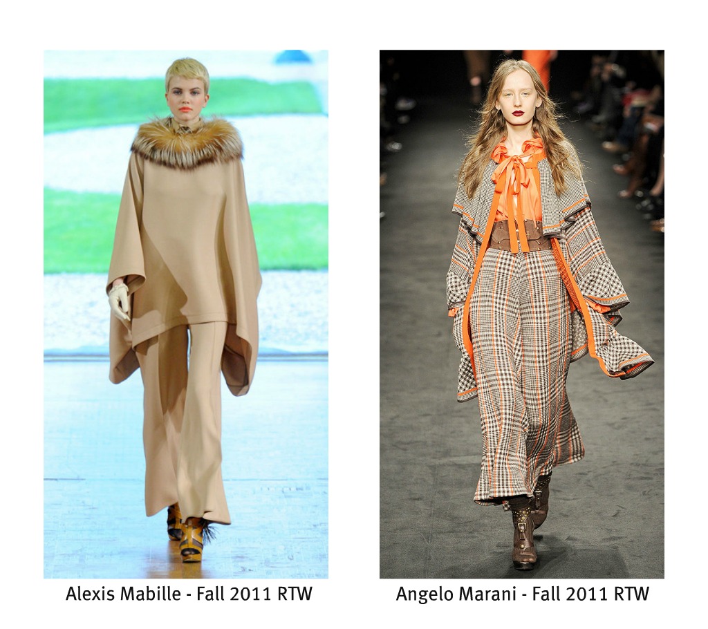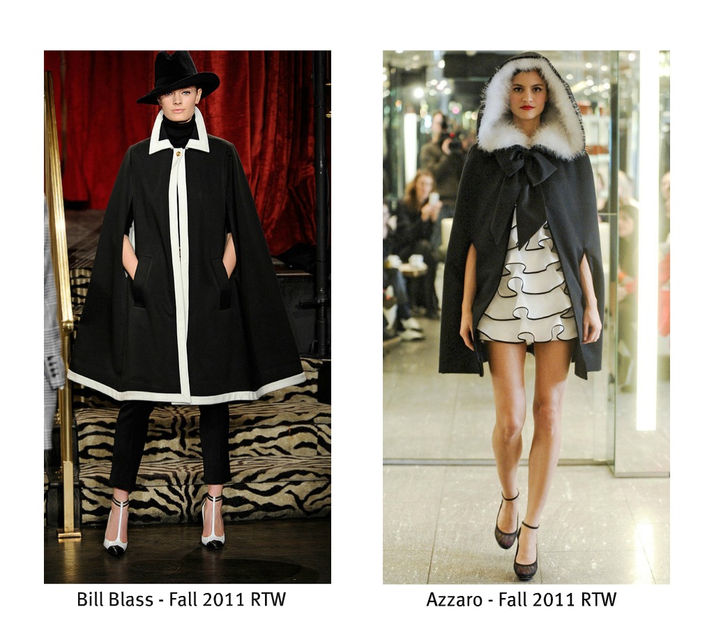 The cape made a comeback last winter along with the poncho, but many fashionistas were quick to acknowledge this as a failed trend. Even I bought a poncho and very quickly, after wearing it only once, donated it to a charity shop. Imagine my surprise when I flipped through the photos from the Fall 2011 ready-to-wear fashion shows and saw capes-a-plenty! I couldn't believe my eyes. Yes fellow fashion lovers, the cape is back and this time around they're really cute!