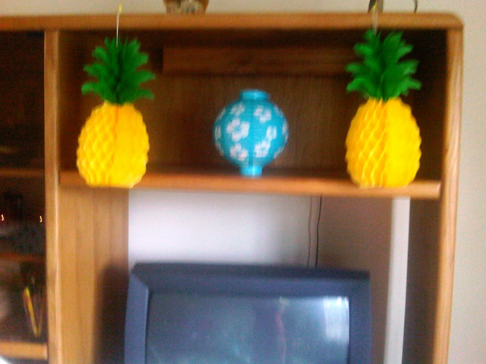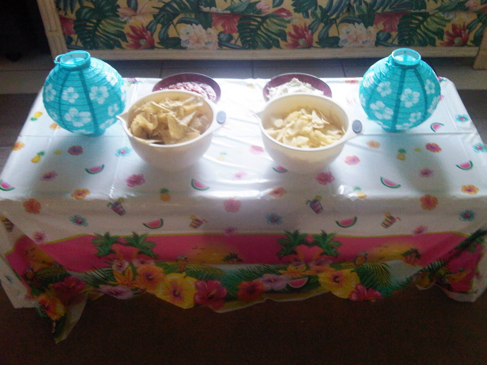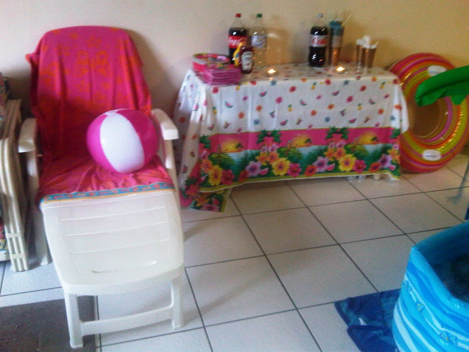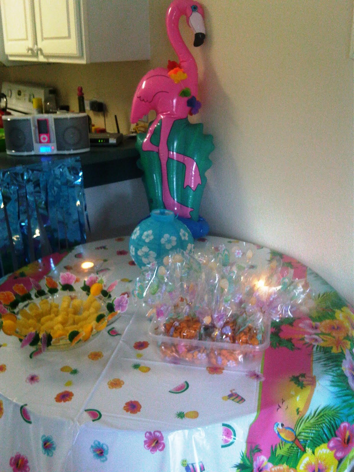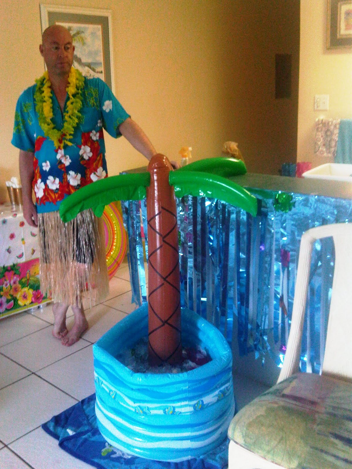 We intended to have this outside by the pool but it poured rain and there was a 60% chance of thunderstorms until 10pm so we moved indoors. This was my favorite decorative piece, the inflatable palm tree cooler!